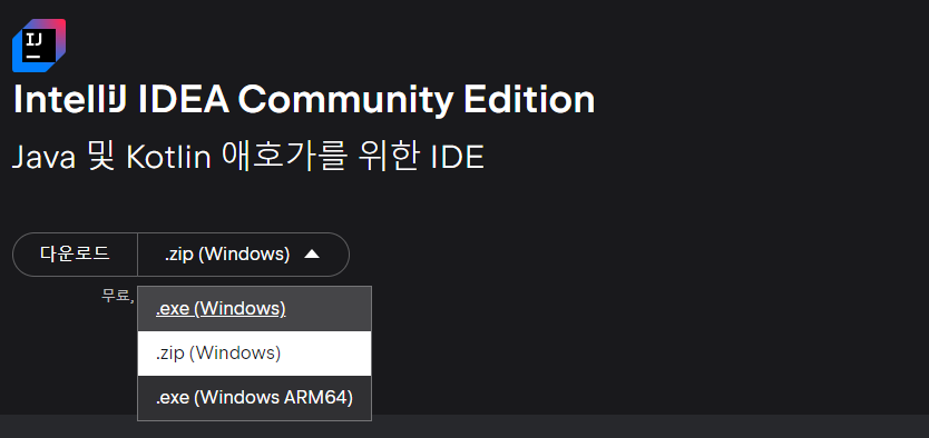 ์ ๋งํฌ์ ๋ค์ด๊ฐ์ Windows OS ์ ํ ํ IntelliJ IDEA Community Edition (๋ฌด๋ฃ ๋ฒ์ ).exe ํ์ผ์ ๋ค์ด๋ฐ์ผ๋ฉด ๋๋ค.